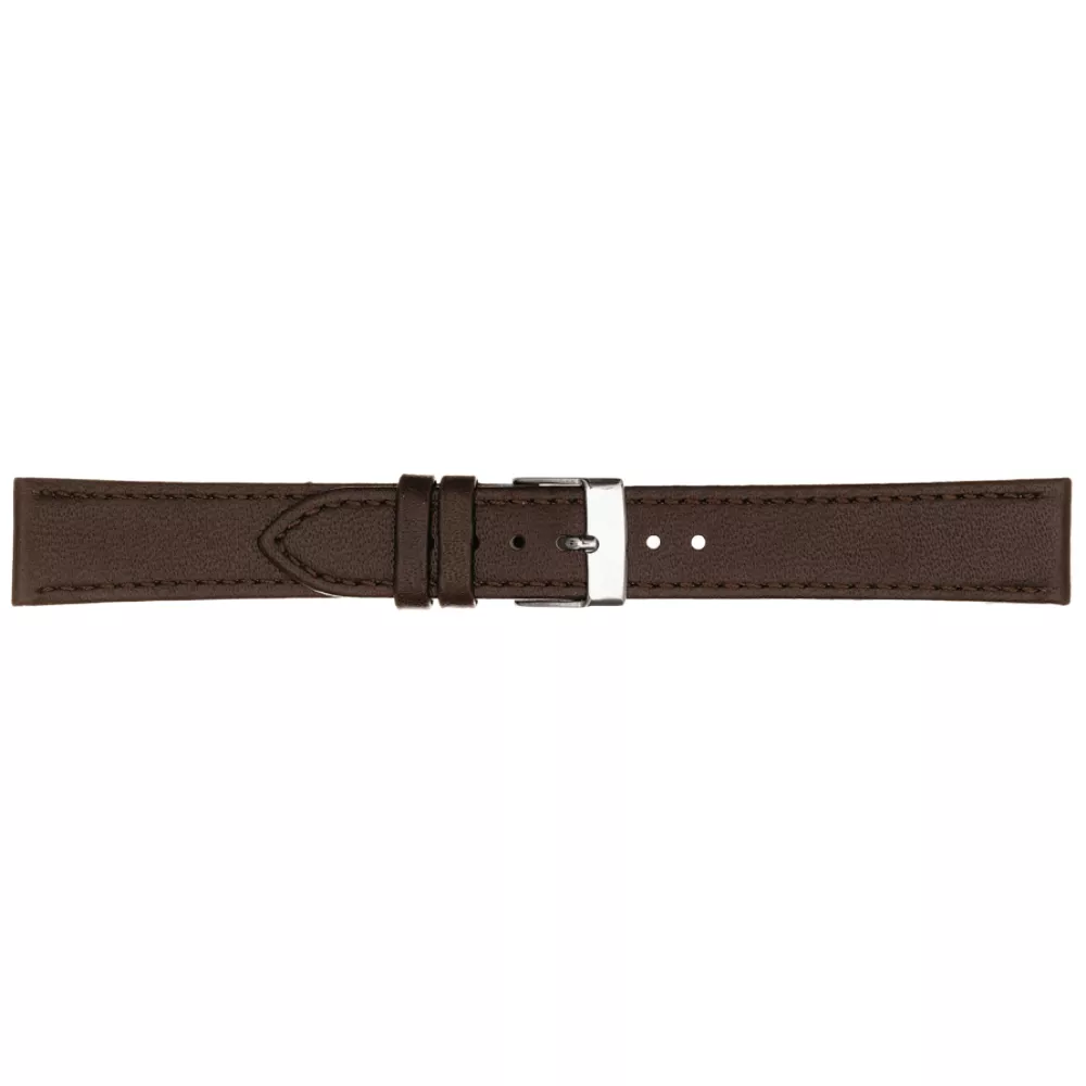 Tamno braon kaiš za sat od teleće kože širine 12mm, izrađen od vrhunske italijanske kože. Opremljen je kopčom od nerđajućeg čelika, sa unutrašnjom postavom od mikrofibera. Polustrukturisan je, sa ravnim profilom i detaljno prošiven za dodatnu izdržljivost i sofisticiran izgled.