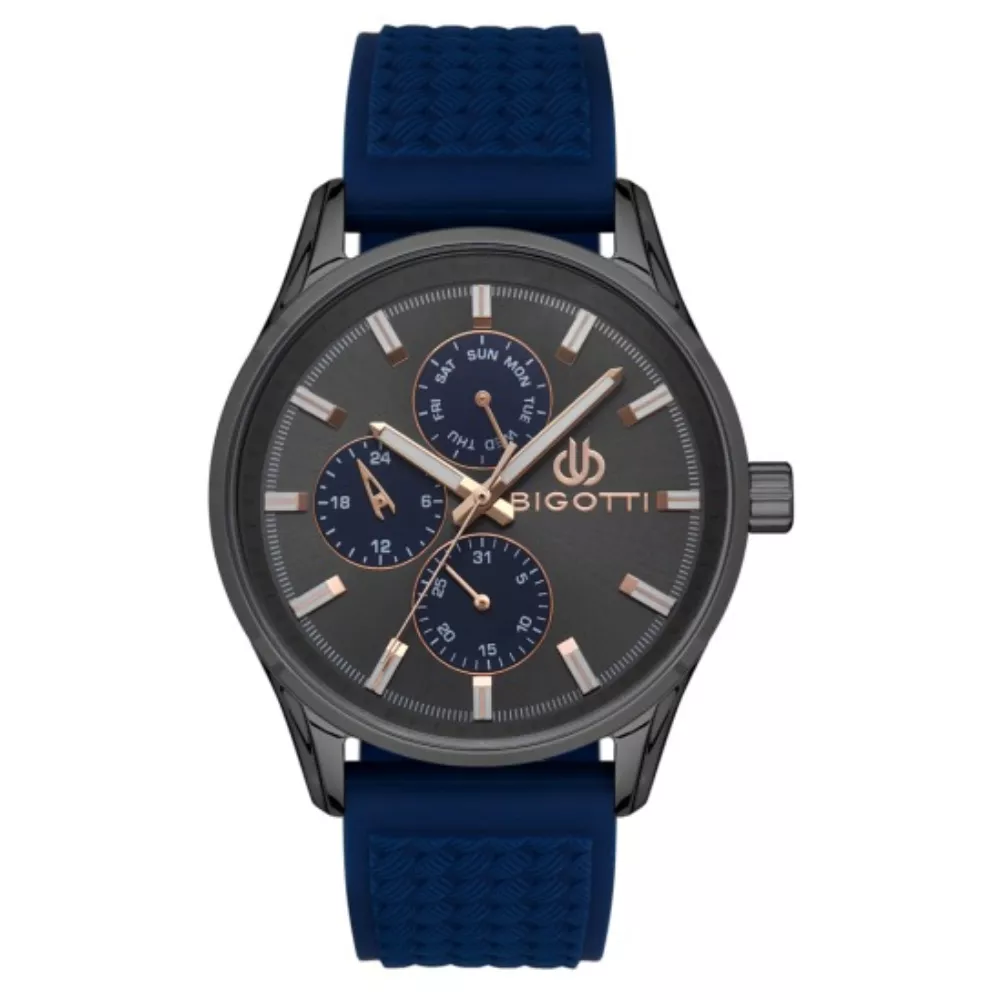Muški ručni sat brenda Bigotti, kućište mu je izrađeno od čelika tamno sive boje dok ga podržava silikonska teget narukvica. Pogodan je za svakodnevno nošenje.
