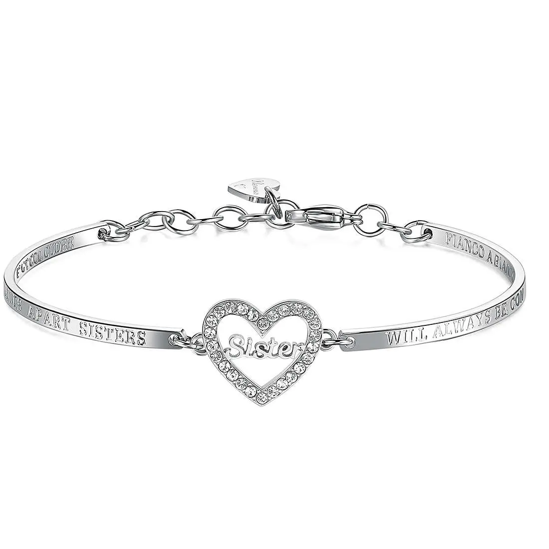 Narukvica od nerđajućeg čelika u boji srebra sa priveskom u obliku srca sa Swarovski kristalima i ispisanom porukom SISTER.