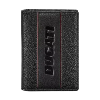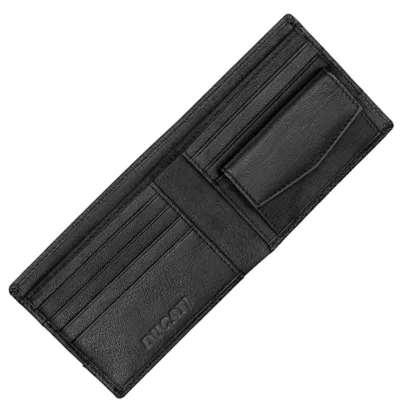 Ducati crni kožni novčanik dimenzija 11 cm X 9 cm. Moderan i funkcionalan aksesoar koji spaja stil i praktičnost, odličan izbor za poklon.