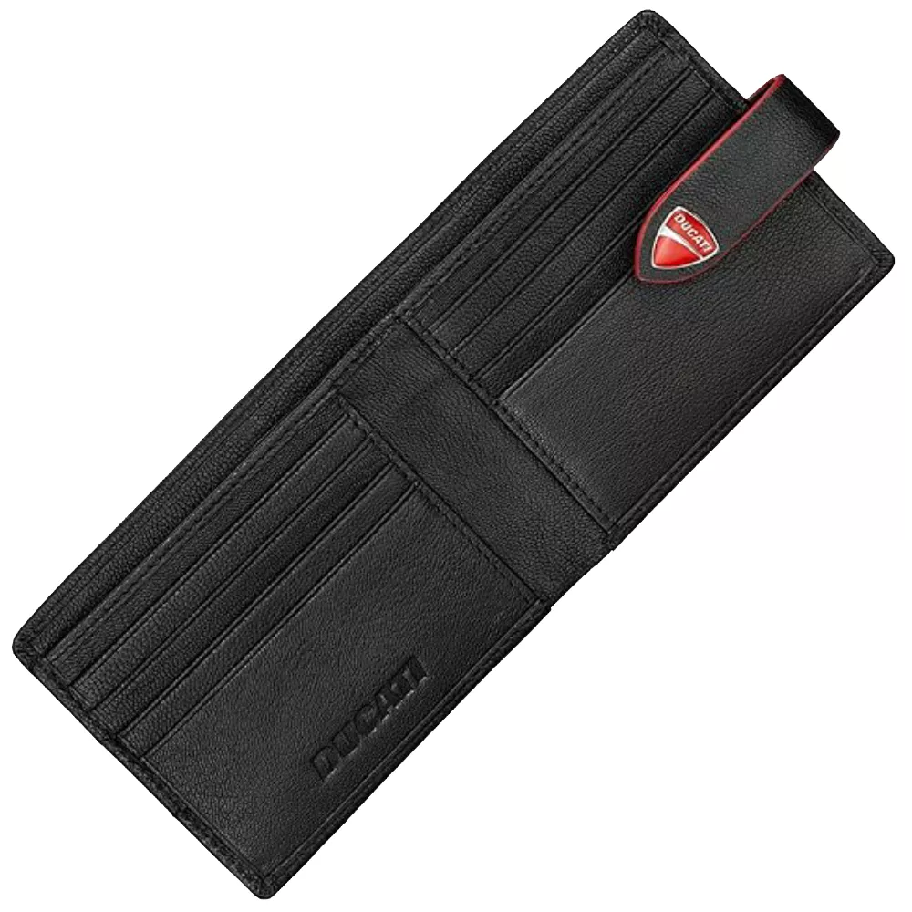 Ducati crni kožni novčanik dimenzija 11 cm X 9 cm. Moderan i funkcionalan aksesoar koji spaja stil i praktičnost, odličan izbor za poklon.
