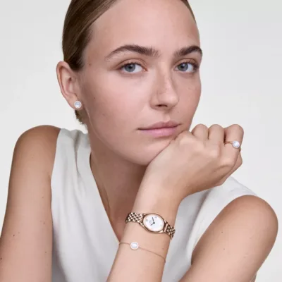Ophelia Mini je jedinstveni ženski sat koji odiše elegancijom i modernim dizajnom. Njegov ovalni beli brojčanik ( 22×25.5mm ) odstupa od klasičnih oblika, donoseći svežinu i sofisticiranost. Ekskluzivna roze zlatna narukvica s novodizajniranim beans link elementima i leptir kopčom savršeno se uklapa u luksuznu siluetu sata. Blago teže roze zlatno ovalno kućište dodatno naglašava njegovu eleganciju, dok suženi lugs delikatno povezuju narukvicu sa kućištem. Brojčanik krase metalni rimski brojevi postavljeni na diskasti uzorak u centru sa sunčanim prelivom, dok su i kućište i narukvica polirani do smelog, sjajnog finiša.