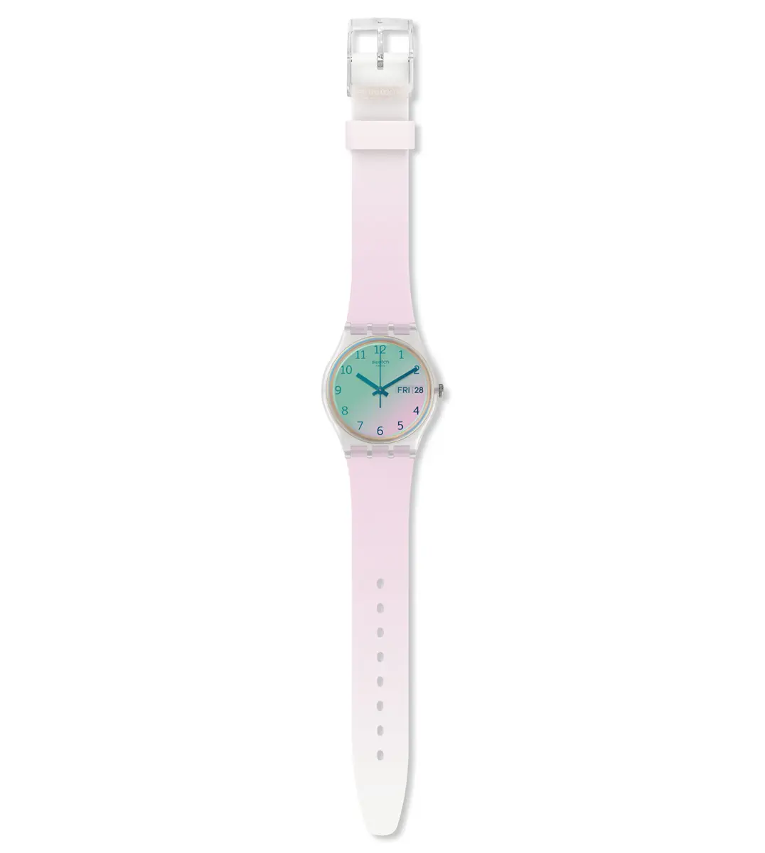 Moderan ručni sat brenda Swatch. Klasičan dizajn sata, Karakteriše providno kučište, bela boja brojčanika sa pokazateljem dana u nedelji i datuma, kao i akrilno staklo koje se presijava u više boja. Sat podržava kvalitetna silikonska narukvica u beloj i bledo rozoj boji. Ovaj model sata je pogodan za svakodnevno nošenje.