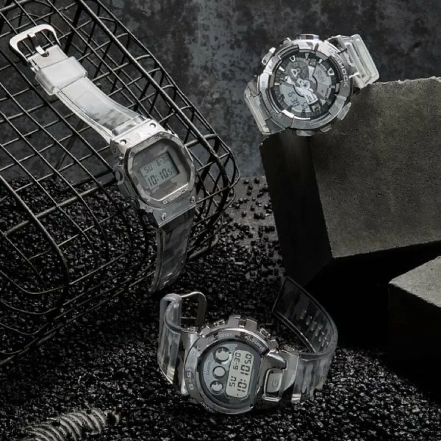 Neobičan poluproziran G-Shock model četvrtastog kućišta dolazi na transparentnoj resin narukvici sa maskirnim printom. Zasnovan je na najnovijoj seriji satova koji poseduju metalnu linetu koja se dvadesetak puta prošla kroz faze kovanja, od sečenja do poliranja, a potom se laserom utiskivao maskirni uzorak. Izuzetan primerak za sve kolekcionare i ljubitelje stila.