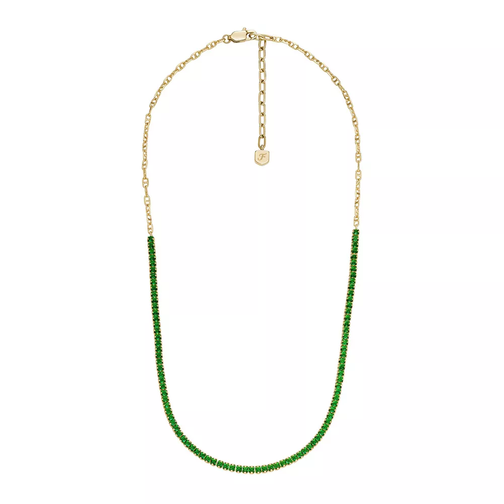 Ova tanka i upečatljiva Fossil ženske ogrlica je lanac od kristala u zelenoj boji. Može se nositi kao poseban komad ili u slojevima sa vašim omiljenim ogrlicama. čini je savršenim dodatkom za različite prilike, od formalnih večernjih događaja do svakodnevnih izlazaka.