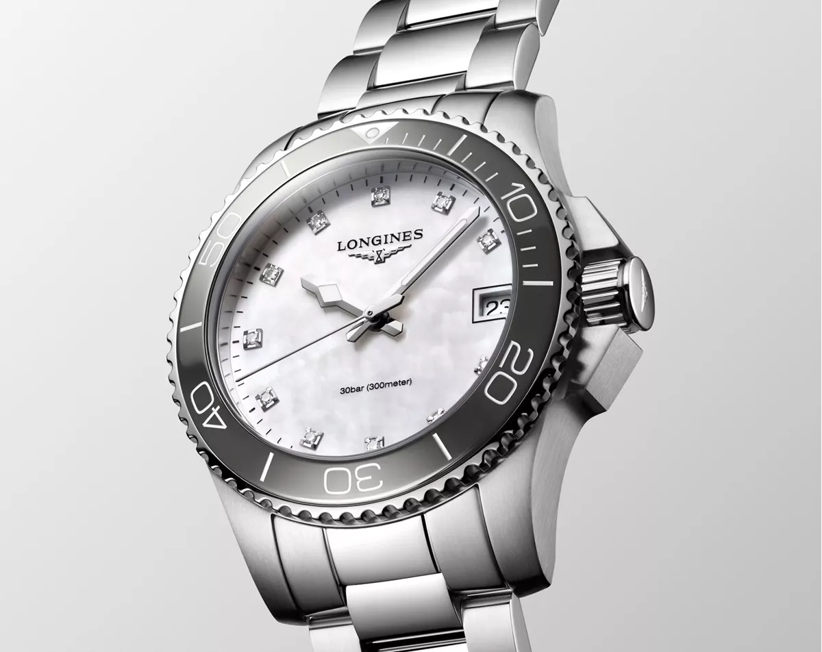 Longines ženski ručni sat iz prestižne kolekcije HydroConquest. Pripada kategoriji profesionalnih ronilačkih satova i ispunjava stroge standarde za ronjenje. Pokreće ga kvarcni mehanizam calibra L156 visoke preciznosti. Kućište je od visokokvalitetnog nerđajućeg čelika koga uokviruje jednosmerna korona sive boje od keramike. Ovaj HydroConquest model privlači pažnju sedefastim MOP brojčanikom čije savršenstvo dizajna upotpunjuje 11 Top Wesselton dijamanata na indeksima. Staklo sa antirefleksnim premazom ima izuzetnu čvrstoću I otporno je na ogrebotine. Dobru vodootpornost na velikim dubinama osigurava krunica na navoj, elegantno smeštena u ležište i zaštićena od udaraca. Sat podržava narukvica od nerđajućeg čelika u boji srebra sa preklopnom sigurnosnom kopčom. Ovaj superiorni model sportske serije namenjen je aktivnim damama koji vrednuju pouzdanost, kvalitet uz moderan dizajn.