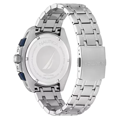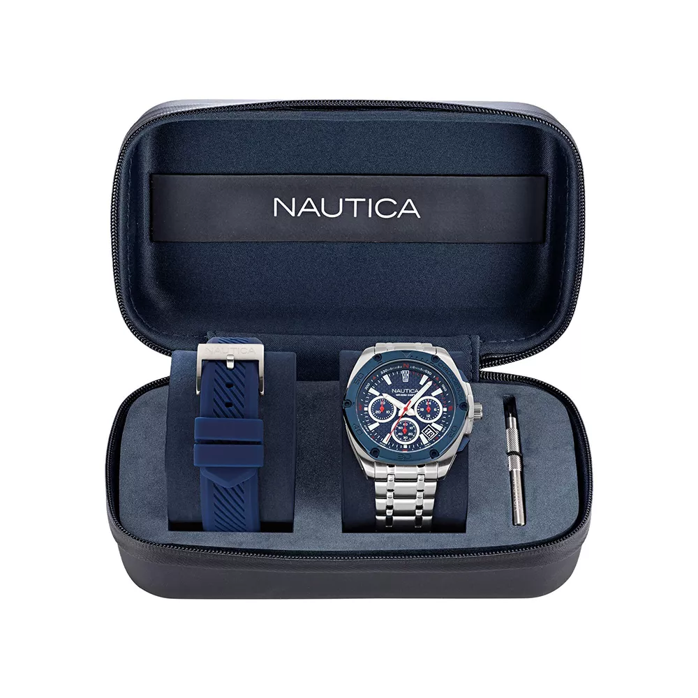 Muški ručni sat Nautica koji dolazi sa dodatnom silikonskom narukvicom u plavoj boji. Kućište modela je izrađeno od nerđajućeg čelika sa teksturnim detaljem na brojčaniku koji je izveden u plavoj boji. Narukvica je izrađena od kvalitetnog nerđajućeg čelika.