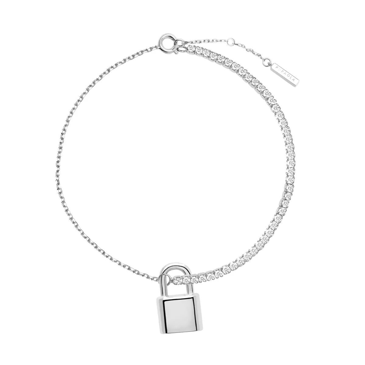 Elegantna srebrna, ženska narukvica sa cirkonima i priveskom u obliku katanca.