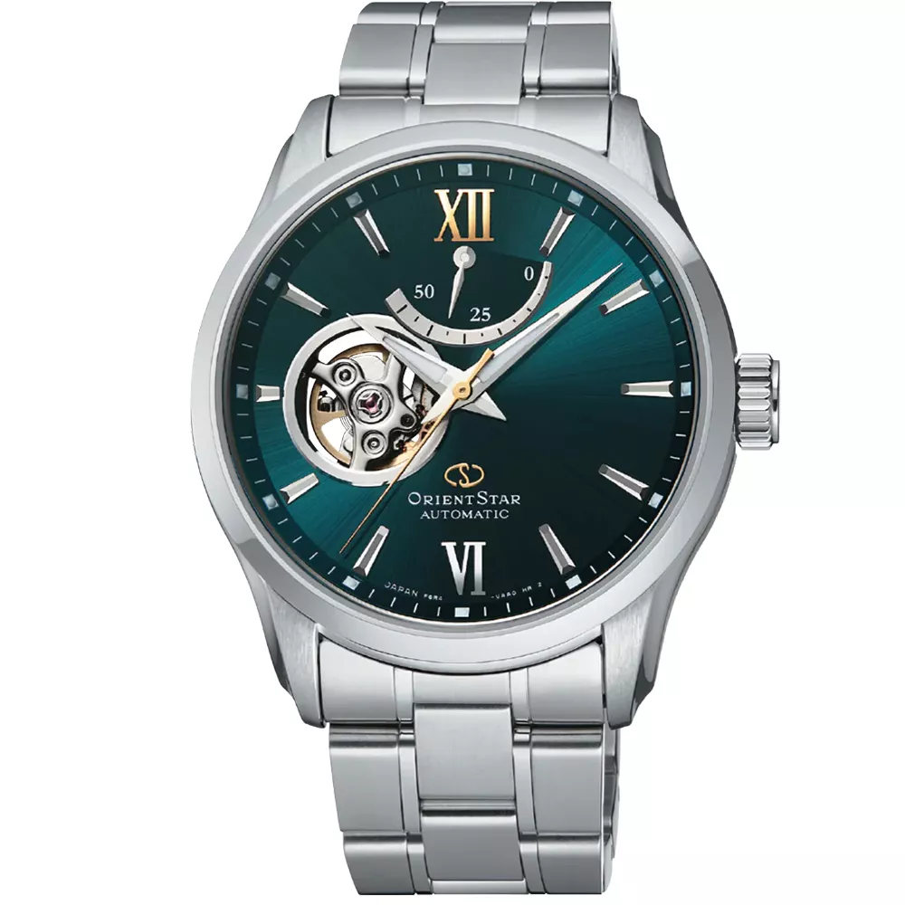 Muški automatic ručni sat renomiranog brenda Orient Star prikazuje impresivno časovničarsko majstorstvo i posvećenost detaljima. Brojčanik očaravajuće zelene nijanse je zaštićen visokokvalitetnim safirnim staklom, prepoznatljivim po otpornosti na ogrebotine i oštećenja, dodatno premazano antirefleksionim slojem zbog bolje preglednosti zadivljujućih detalja. Kazaljke i markeri su presvučeni luminiscentnim slojem, na poziciji 12h se nalazi indikator napunjenosti rezervne snage, a na poziciji 9h je "open heart" element. Sat pokreće japanski mehanizam kalibra F6R42 sa 22 dragulja, a potpun vizuelni doživljaj zaokružuje providna poleđina kućišta i čelična narukvica koja podržava ovaj model.