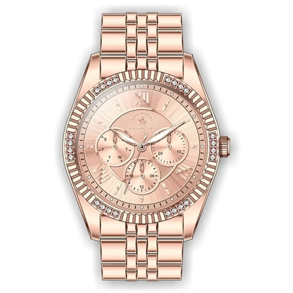Ženski ručni sat brenda Santa Barbara Polo, iz kolekcije Unique. Karakteriše ga roze zlatna narukvica i kućište koje je dodatno istaknuto diskretnim cirkonima što čini ovaj model atraktivnim i pogodnim za svakodnevno nošenje.