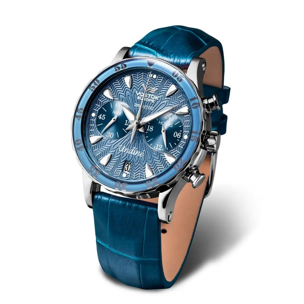 Ženski set brenda Vostok sadrži 3 narukvice u plavim nijansama; silikonsku, kroko – kožnu i sjajnu kožnu. Ovaj model iz kolekcije Undine, predstavlja kraljicu vode (budući da reč Unduo označava vodu). Undine su lepe sirene dugih kosa koja žive u izvorima u šumama i koje svojim plesom i pesmom zavode mlade momke. Zahvaljujući dodatnim narukvicama, sat od sportskog, može da poprimi izuzetno elegantan izgled, i funkcionalan je u svakoj prilici, pa čak i onoj najekstremnijoj jer je vodootporan na 200m. Karakterišu ga plava boja brojčanika sa gijošem i plavim podbrojčanicima, kao i linetom i kaišem u istoj boji. Srebrno kućište se lepo uklapa uz plavu boju i kao celina, ovaj model postaje izuzetan primerak neizostavnog, svakodnevnog aksesoara.